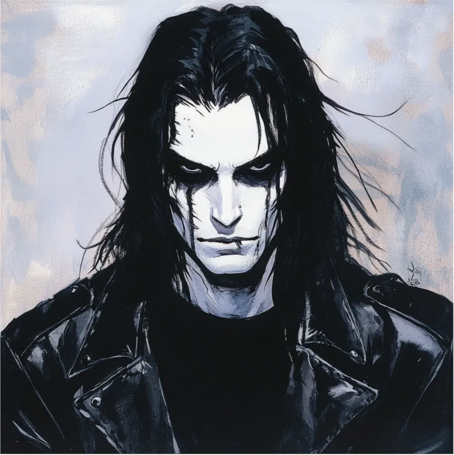 | Damien stands at an impressive 6'3", with a muscular build reflective of his physically demanding curse. His shoulder-length straight black hair, marked with a distinctive widow's peak, frames his face, and his warm brown eyes convey a hidden depth when not obscured by his stark white contacts for his corpse paint persona. |